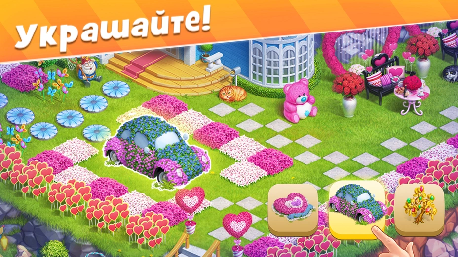 • 🌳 Ландшафтный дизайн — прокладывайте дорожки, разбивайте клумбы, ставьте заборчики и фонари. Превратите усадьбу в райский сад.