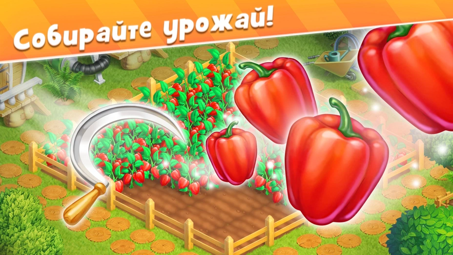 • 🌽 Собирайте урожай — сажайте фрукты и овощи на полях, вовремя поливайте и удобряйте, чтобы получить богатый урожай. Клубника, кукуруза, помидоры, яблоки — ассортимент культур постоянно растёт.