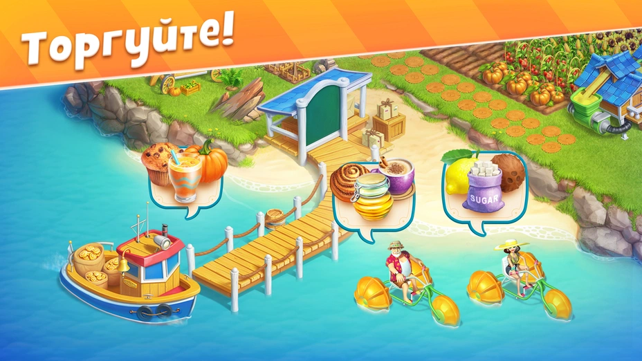 • 💰 Продавайте и зарабатывайте — сбывайте продукцию заезжим торговцам или соседям. Монеты нужны для новых построек и улучшений.